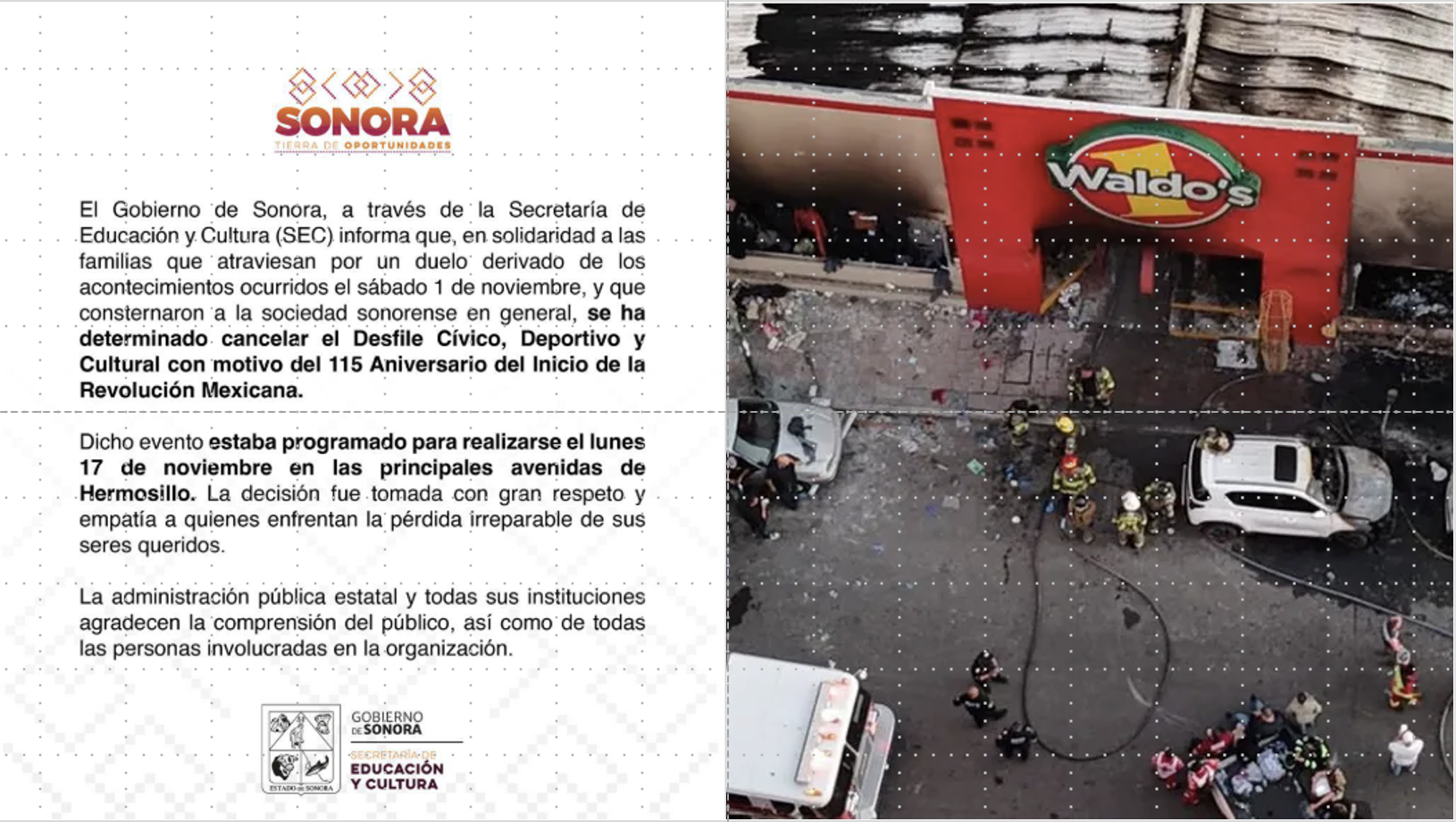 Hermosillo, Sonora.- En solidaridad a las familias que atraviesan por un duelo, derivado del incendio en el establecimiento comercial Waldo"s registrado el pasado 1 de noviembre, el gobierno de Sonora informó que se cancela el Desfile Cívico, Deportivo y Cultural con motivo del 115 Aniversario del Inicio de la Revolución Mexicana.